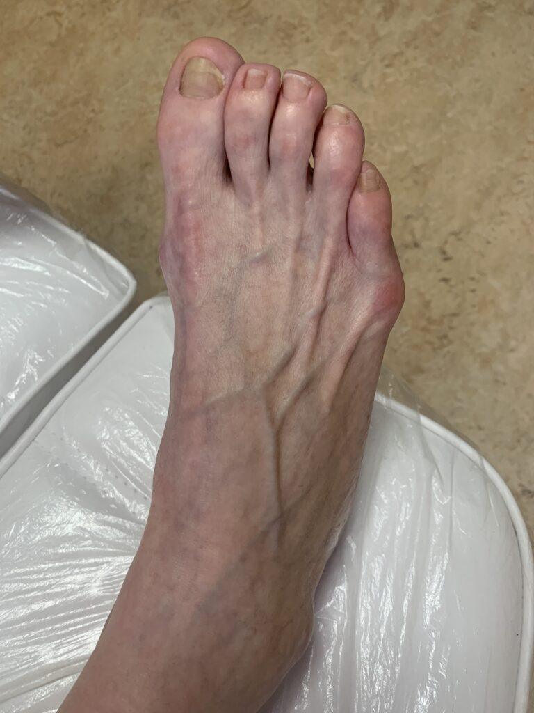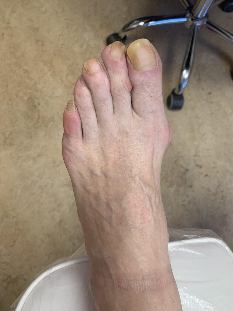 Eaka inimese jalg ealiste iseärasustega.Kollakad paksenenud küüned, konnasilm, hallux valgus, võlvi vajumisest tingitud varvaste väärasendid